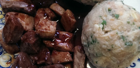 Gulasch an Portweinsauce mit selbstgemachten Semmelknödeln (2013)